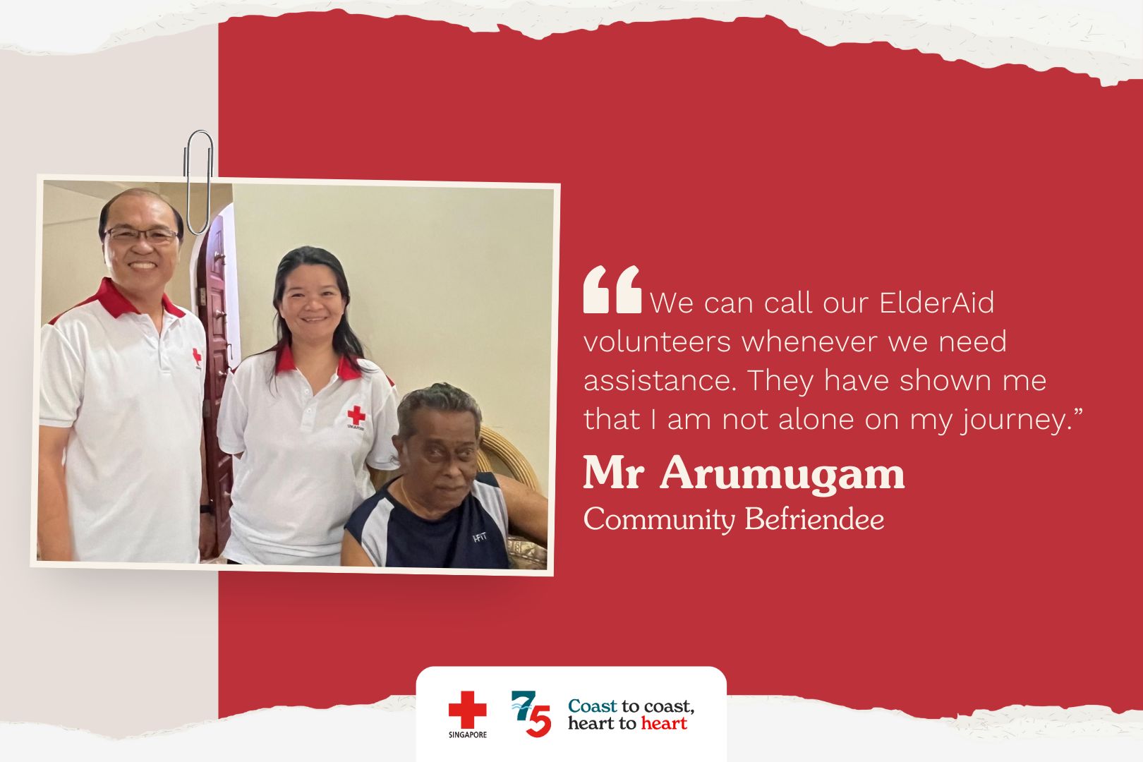 As we commemorate the International Day of the Older Persons on 1 October, we share the story of Mr A. Arumugam S/O Murugam Alagan. Fortunately, a kind-hearted family cared for him. Now aged 79, Mr Arumugam, a bachelor and a retiree, contends with abnormal heart rhythms, diabetes, and hearing impairment. Mr Arumugam and his kindhearted friend, Mr Renga, sought assistance from a social service centre, which referred Mr Arumugam to the Singapore Red Cross (SRC) ElderAid programme. Since enrolling in SRC's ElderAid programme in March 2018, Mr Arumugam has found comfort and positivity through the ElderAid volunteers' regular visits. His inspiring story depicts resilience in the face of adversity, and the importance of establishing ties that bind.