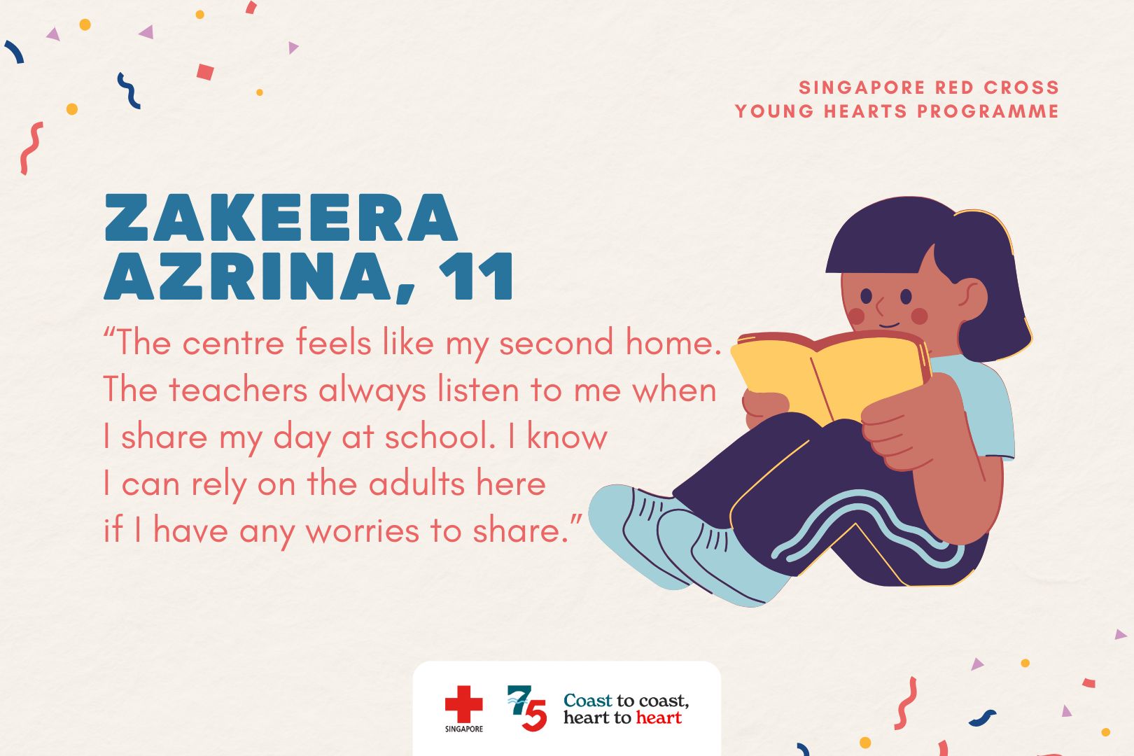 Zakeera Azrina (not her real name), 11, had been grappling with low self-esteem stemming from her autism and her family's economic woes. Since enrolling in the Singapore Red Cross (SRC) Young Hearts Programme in January 2023, she has made academic improvements, discovered her artistic potential, and found her second home. In this safe space, she could share her innermost feelings. She has regained the assurance of pursuing her dreams.