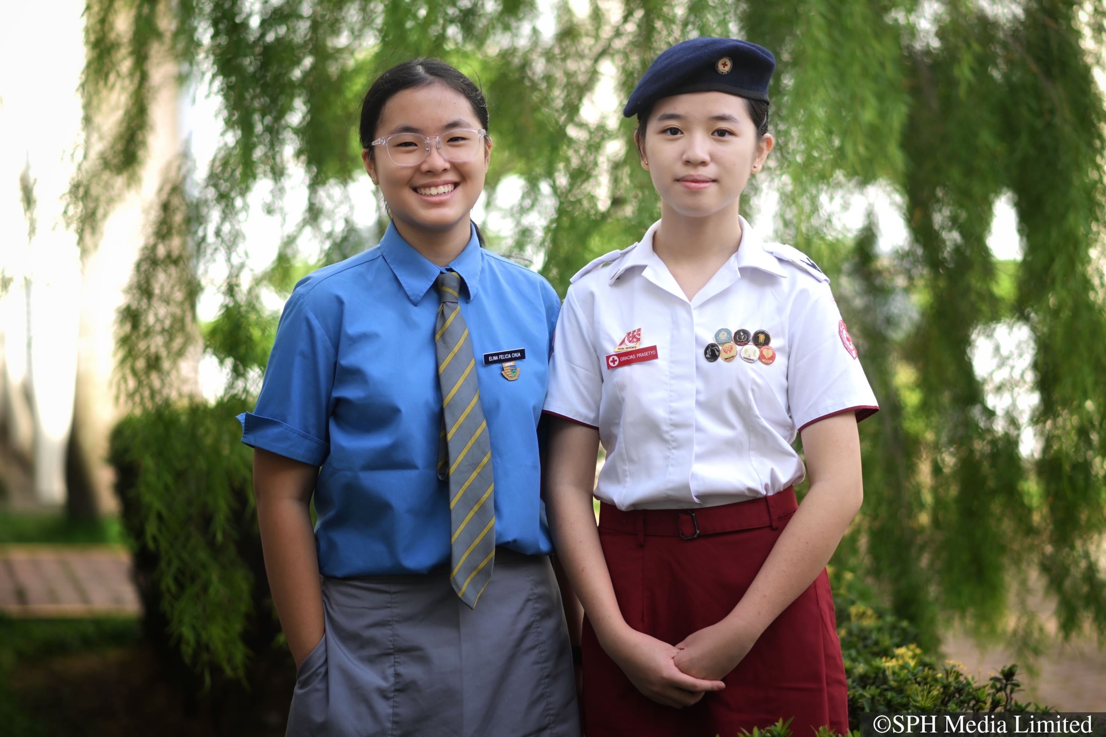 Cedar Girls' Secondary School students Elina Chua (left), 13, and Gracias Prasetyo, 16, rushed to a cardiac arrest case on Feb 4 in Potong Pasir. ST PHOTO: CHONG JUN LIANG