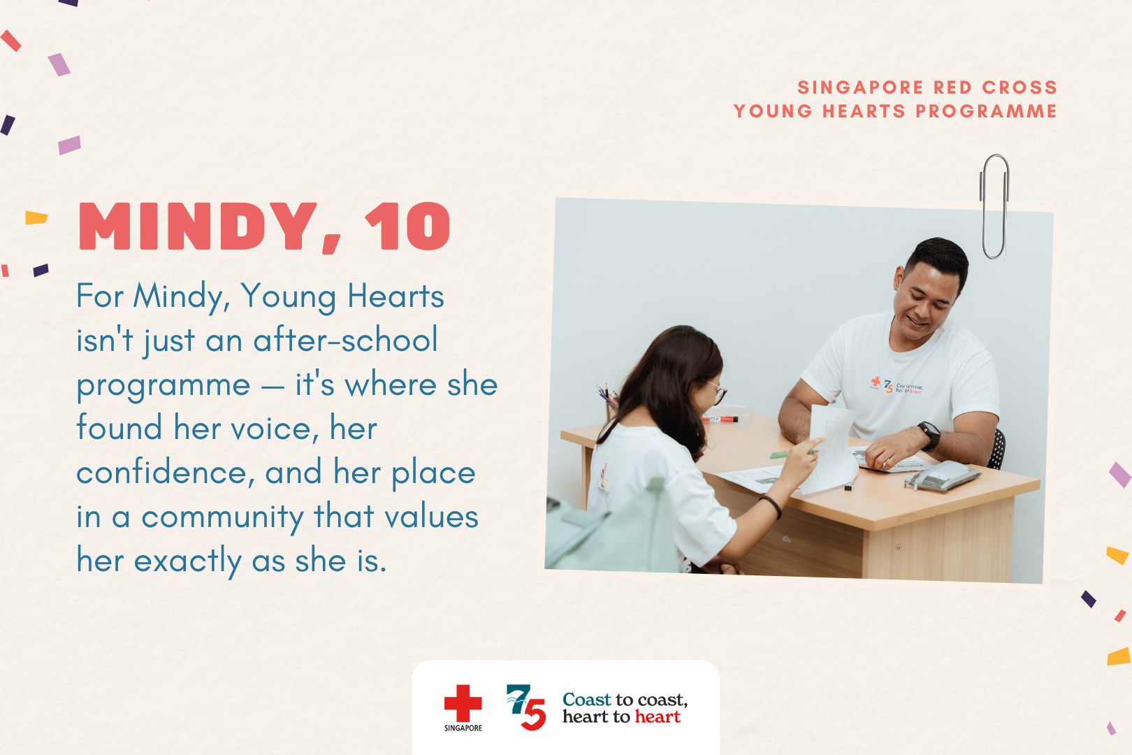 For Mindy, Young Hearts isn't just an after-school programme — it's where she found her voice, her confidence, and her place in a community that values her exactly as she is. Her journey reflects how a safe, supportive space like Young Hearts can empower children to discover their voice, step into leadership roles, and find strength in connection.