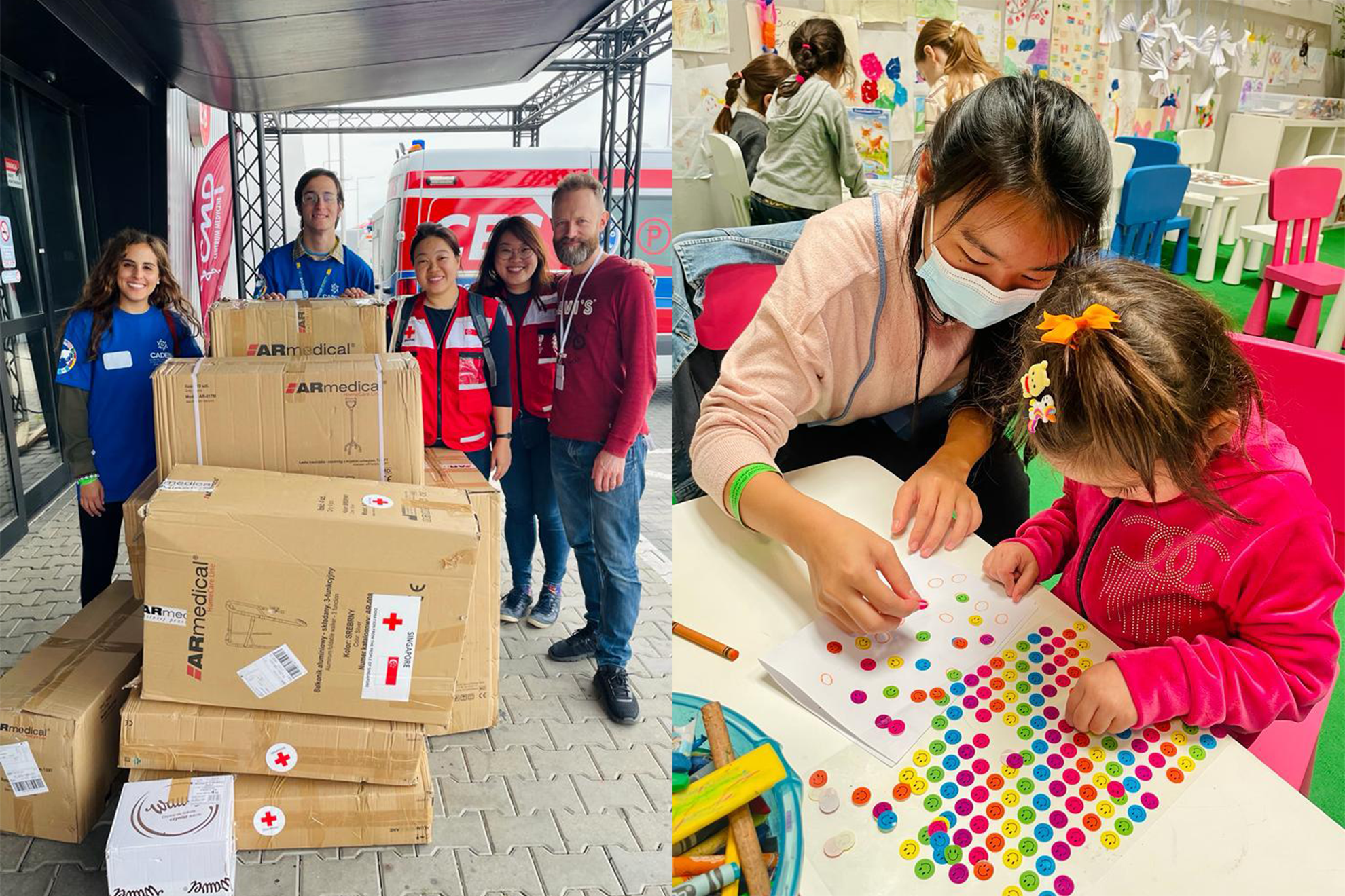 Over the past three weeks, SRC deployed two psychosocial support responders to Poland’s largest assistance centre, PTAK Humanitarian Aid Centre, to support the Child Safe Space. The two Singaporeans engaged mothers and children in psychosocial support activities such as sports, art therapy, and more. The team also distributed childrens’ shoes and 350 child care packs consisting of notebooks, crayons, children’s toothbrush and toothpaste, and stress balls. Additionally, they distributed 100 walking aids and 340 trolley bags to the other refugees staying at the Humanitarian Aid Centre, to support them in their continuing journey.