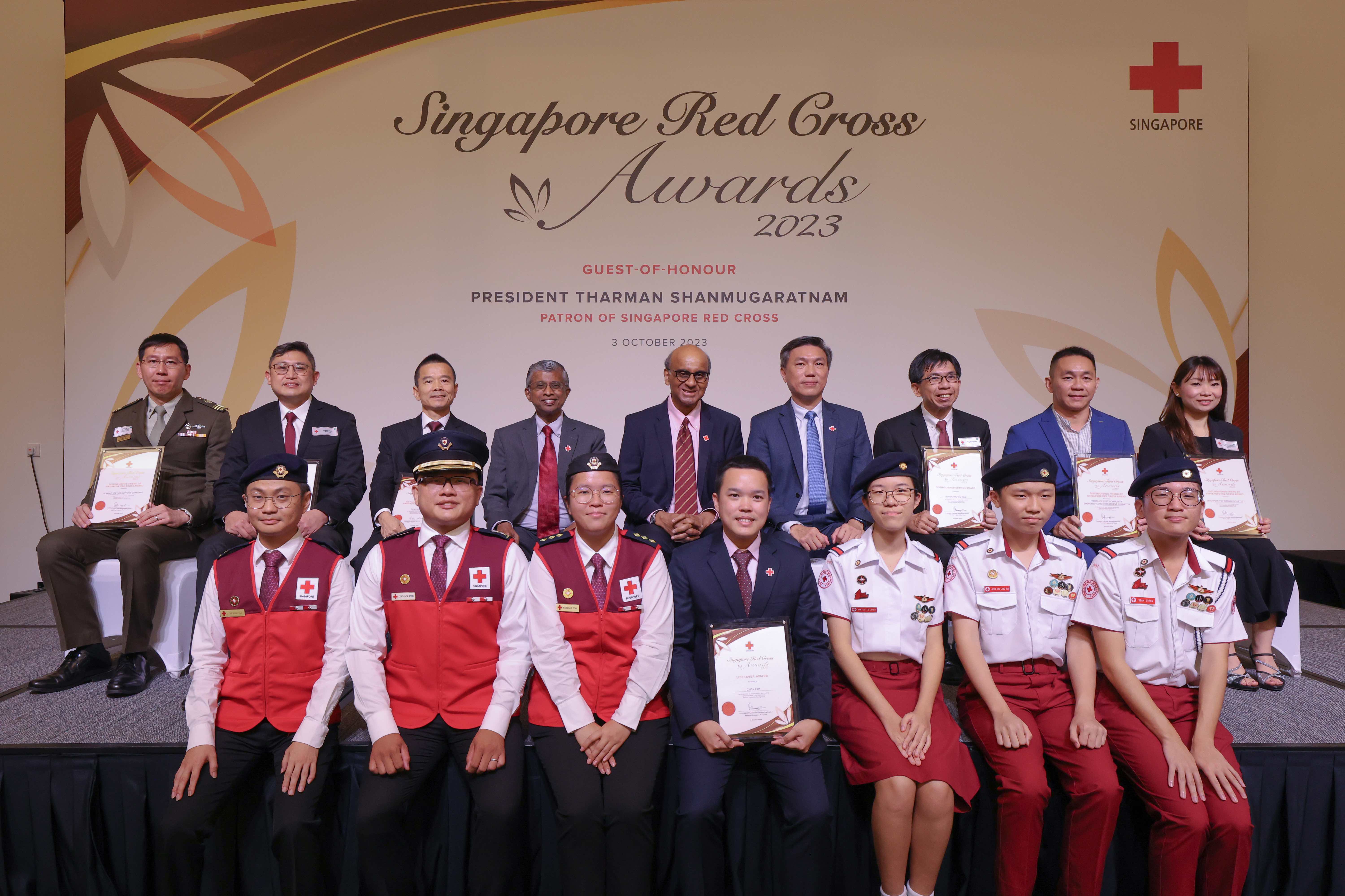 Singapore, 3 October 2023 — The Singapore Red Cross (SRC) recognised 116 volunteers, donors and partners at its annual Awards Ceremony today, for selflessly giving their time, expertise and resources. Guest-of-Honour and Singapore Red Cross Patron, President Tharman Shanmugaratnam graced the Ceremony and presented the Awards. He also opened the newly refurbished Red Cross House at Penang Lane.