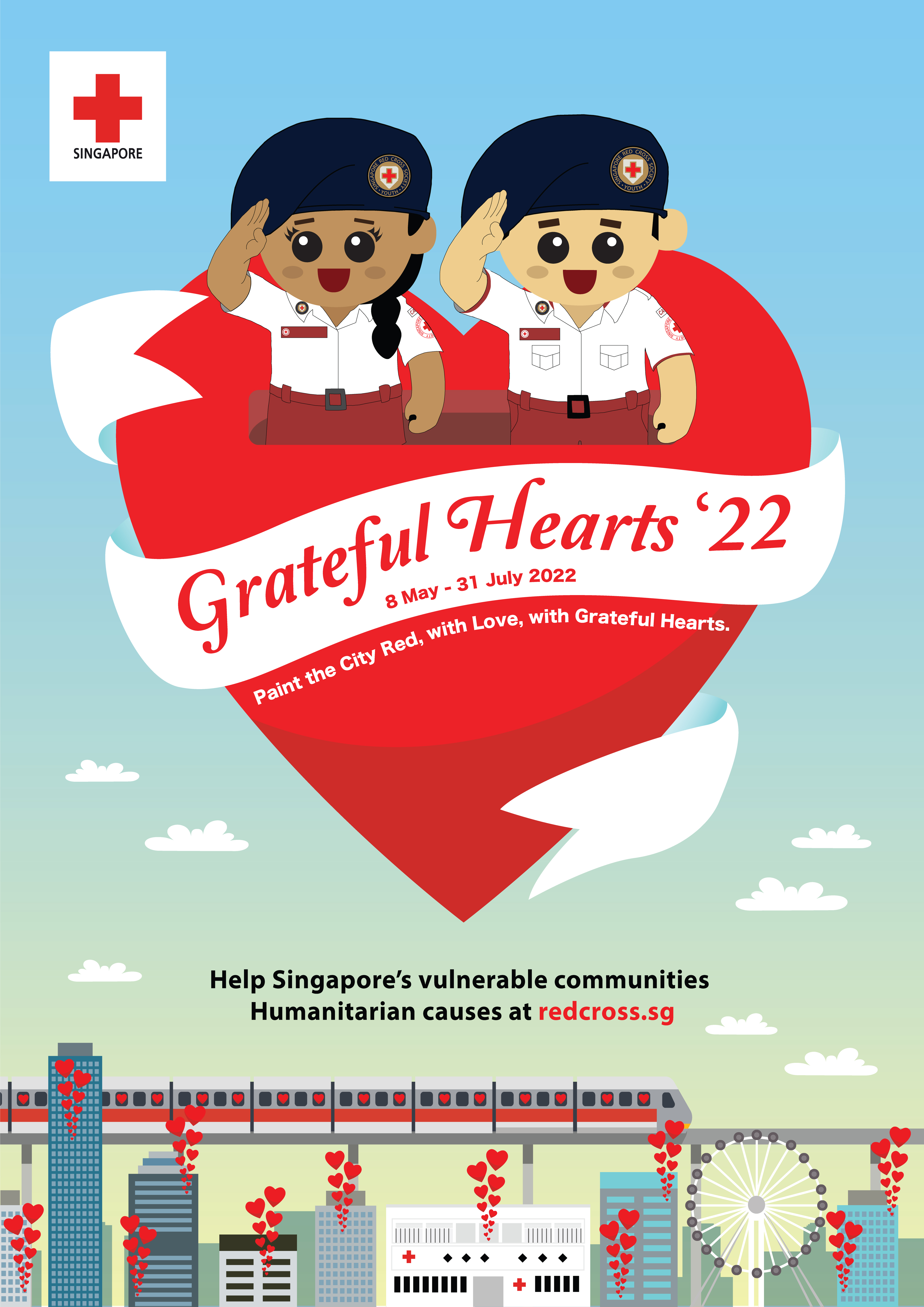 To commemorate World Red Cross Day, the Singapore Red Cross (SRC) is organising Grateful Hearts 2022 - Paint the City Red, with Love! with Grateful Hearts!, our annual signature fundraiser, from 8 May to 31 July 2022. We invite everyone to come together to send help and hope to the vulnerable. Your partnership can translate directly to social good, and make a real impact in the community. When you support the Red Cross, you help the severely disabled, the isolated elderly and the low-income skipped-generation / single parent families.