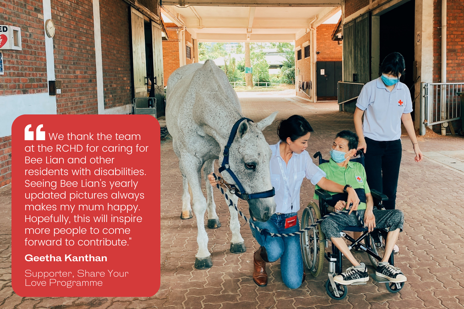 In 2017, Geetha Kanthan and her family adopted Bee Lian under the RCHD Residents Adoption Programme, which allows corporates and individuals to contribute to the essential expenses of RCHD residents, thereby easing the financial burden on the residents’ families. Geetha's family has been donating annually with the aim of inspiring others to do the same.