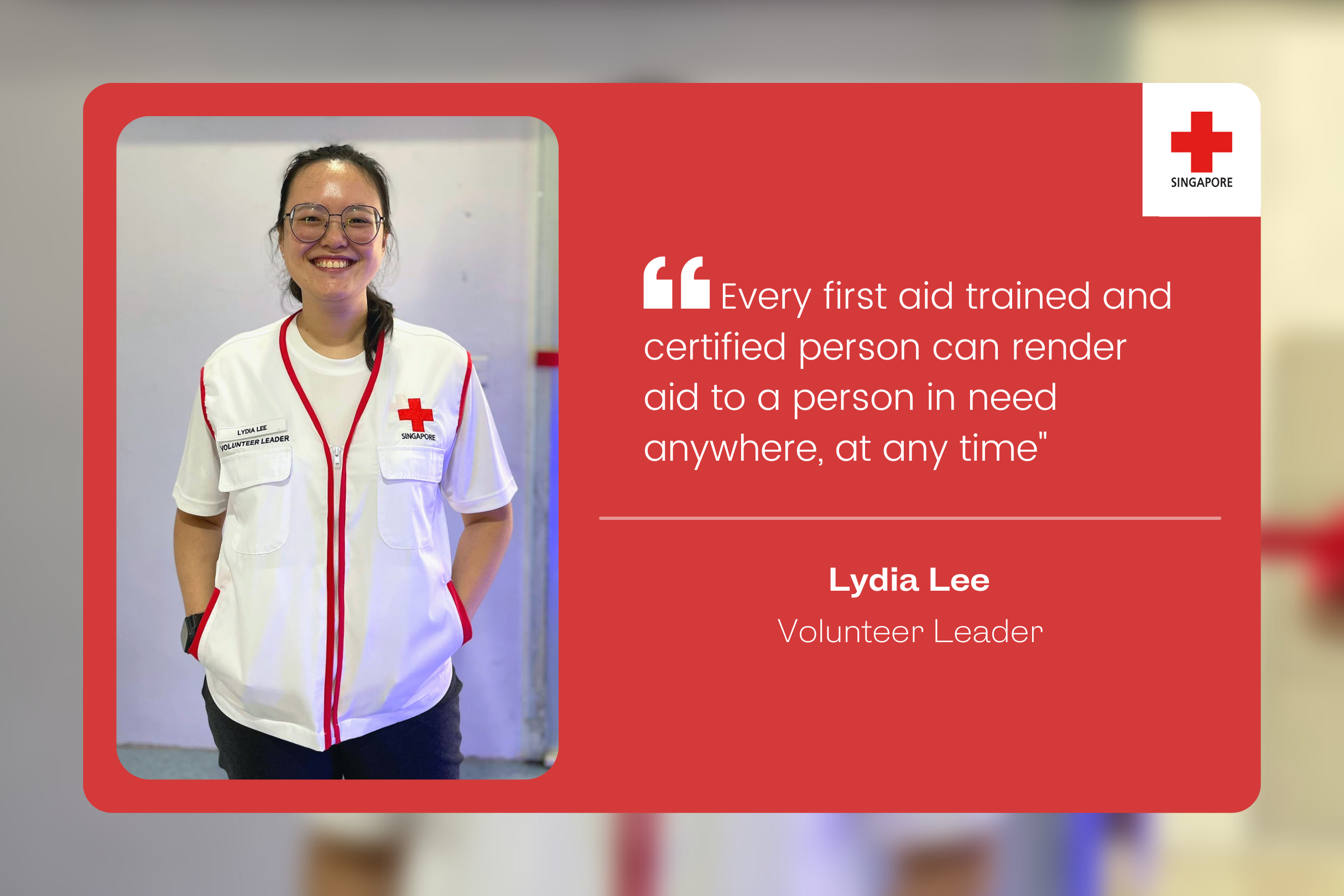 Lydia Lee has always enjoyed volunteering and helping others. Having witnessed her junior college schoolmates sustain lacerations and bruises after getting into scrapes, she picked up first aid and was volunteering with another organisation. Inspired by the professionalism and willingness to help of the Singapore Red Cross (SRC) volunteer first aiders who served at an event, she connected with the SRC and learnt first aid.