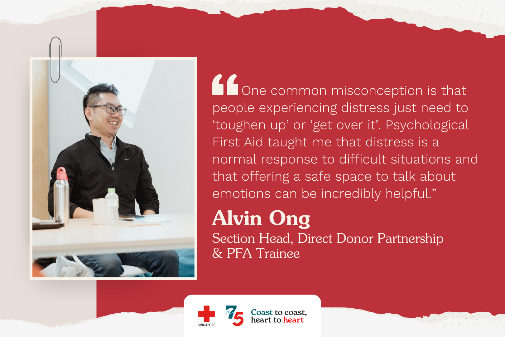 From boardrooms to living rooms, Alvin learnt that a little empathy can go a long way — one conversation at a time. He dreams of a day where individuals are all PFA-trained, and better equipped to support one another during moments of panic and disaster.