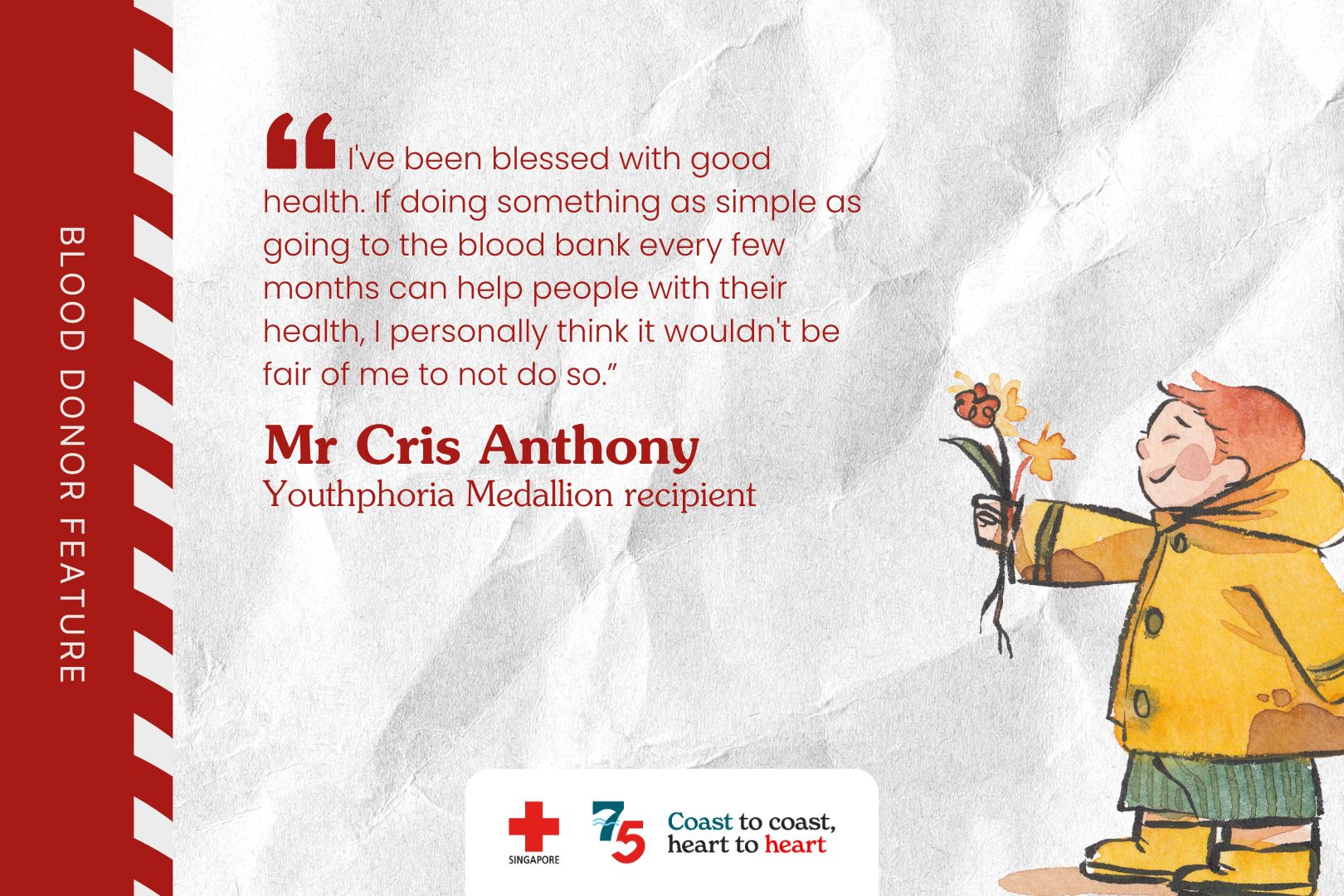Cris’s journey as a blood donor began at 19, during a blood drive organised with his National Service unit. Like many first-time donors, he was afraid of how painful it would be.