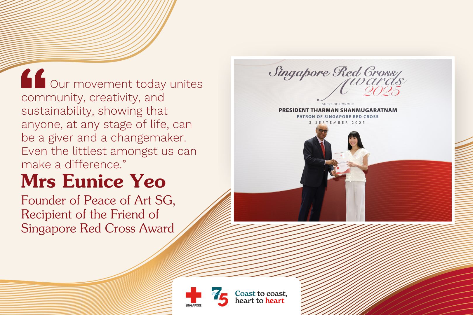“I am deeply honoured to receive the Friend of Singapore Red Cross Award as it affirms that grassroots initiatives, creativity, and the collective heart of a community can truly make a difference in the lives of children who need our support. It motivates me to continue fostering empathy, action, and giving in Singapore.”