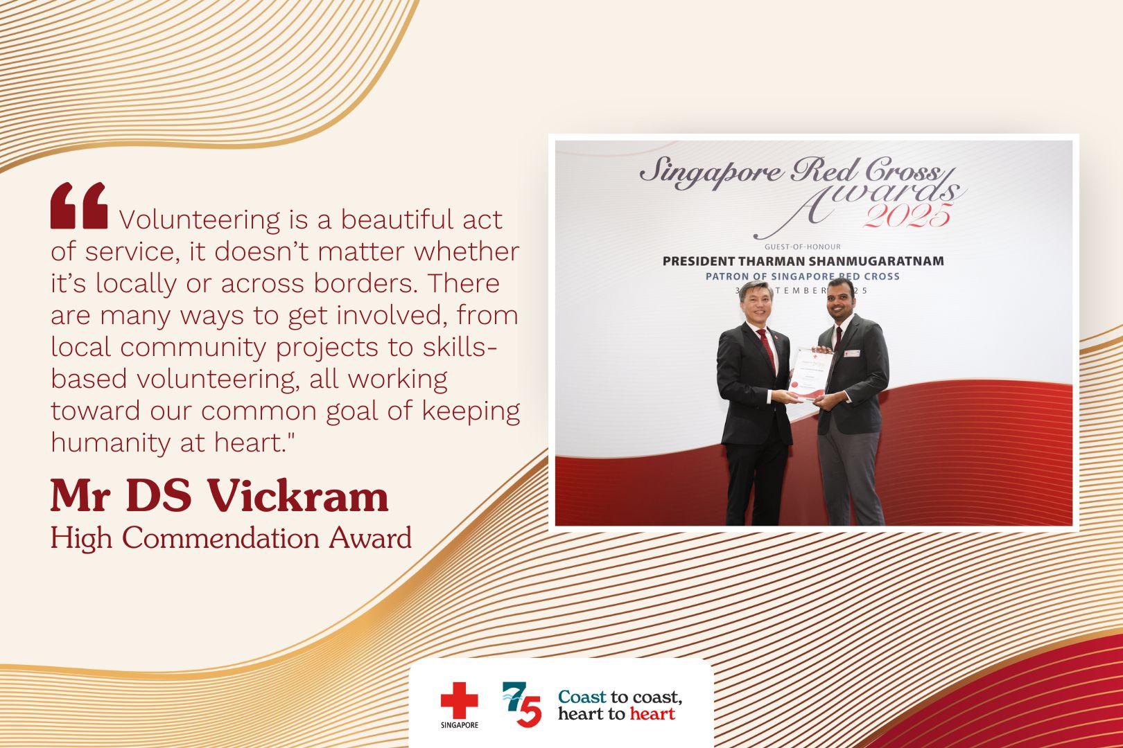 Mr DS Vickram was 22 years old when he first began his volunteering journey with the Singapore Red Cross Academy (SRCA). After ten years of growth and service in various parts of the organisation, Mr DS Vickram will be receiving the High Commendation Award for his exceptional and sustained voluntary service to the Singapore Red Cross.