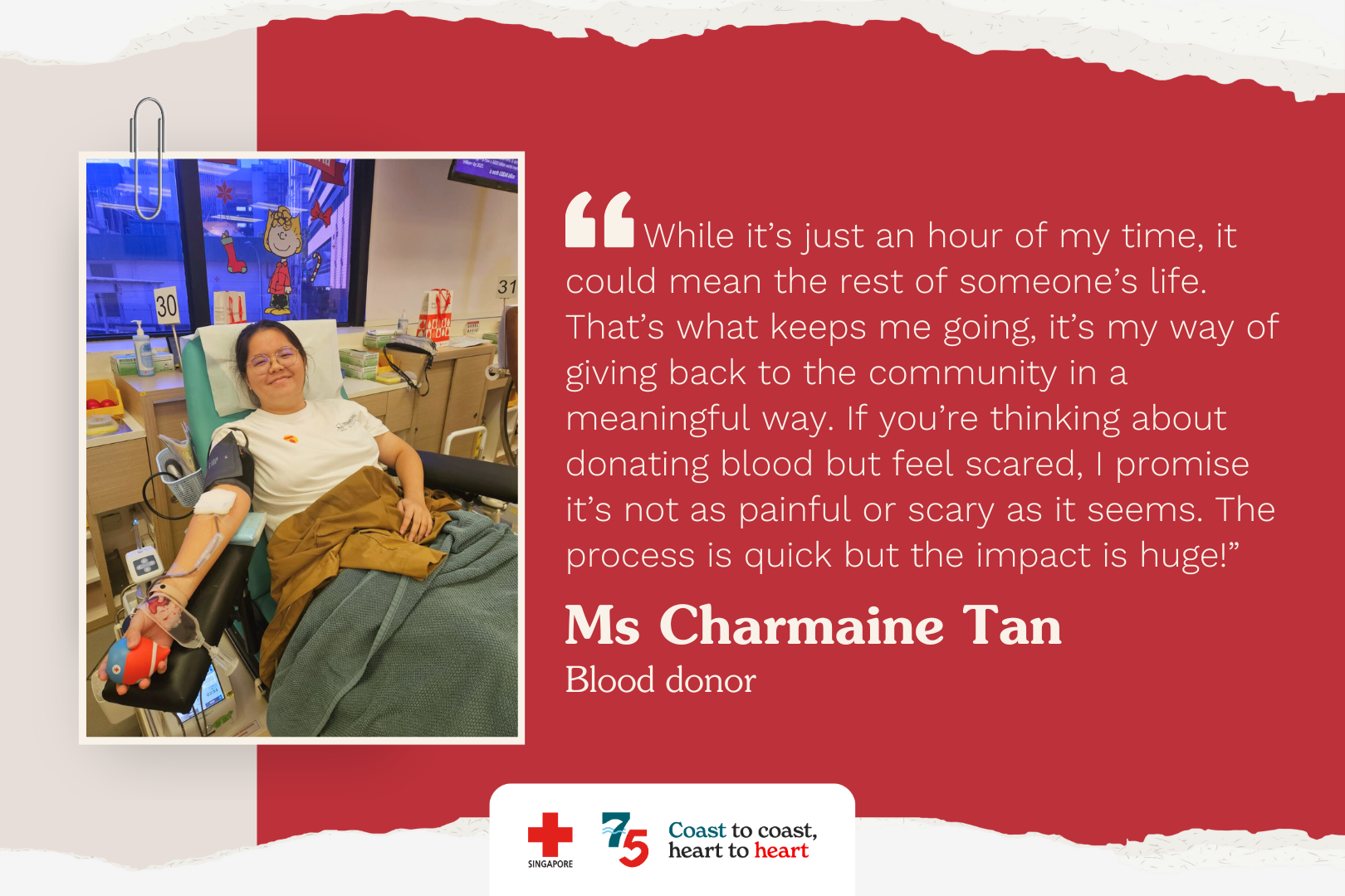 “I was really afraid of the entire process. But the volunteers and nurses were amazing. They constantly reassured me, made me feel comfortable, and walked me through everything. The blood bank felt so warm and homely, it helped calm my fears.”